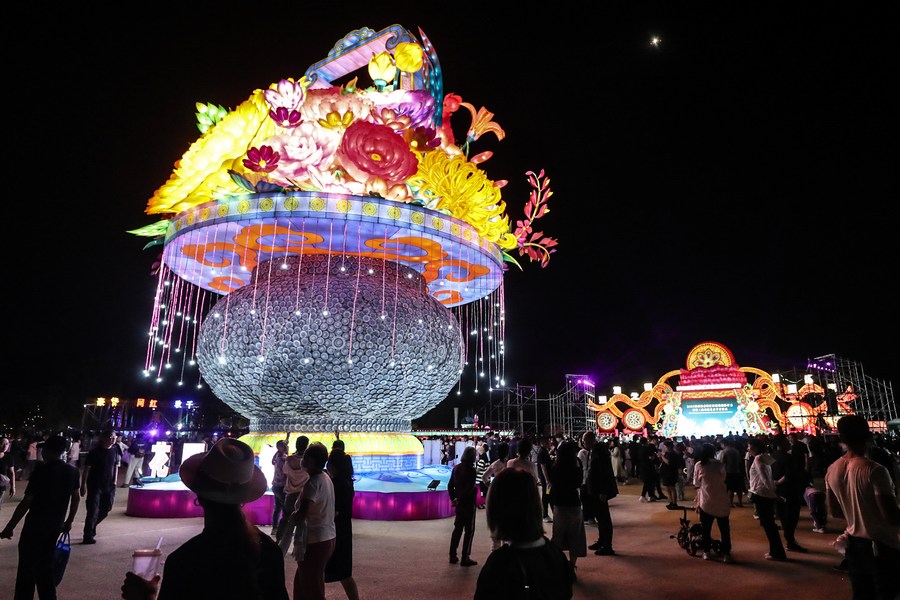 People watch a lantern show at the Liaohe wetland park in Panjin, northeast China's Liaoning Province, Sept. 1, 2023. Hundreds of light installations were displayed at the lantern show. (Xinhua/Pan Yulong)