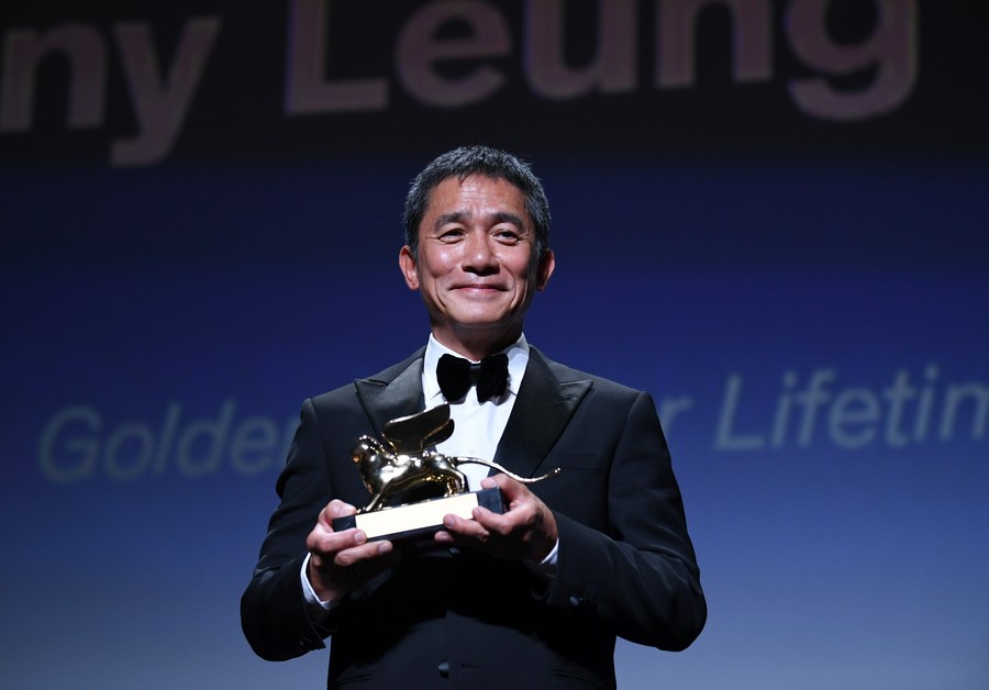 Actor Tony Leung Chiu-Wai poses with his trophy at an award ceremony during the 80th Venice International Film Festival in Venice, Italy, on Sept. 2, 2023. Tony Leung Chiu-Wai of Hong Kong, China was presented with the Golden Lion for Lifetime Achievement during the event on Saturday. (Xinhua/Jin Mamengni)