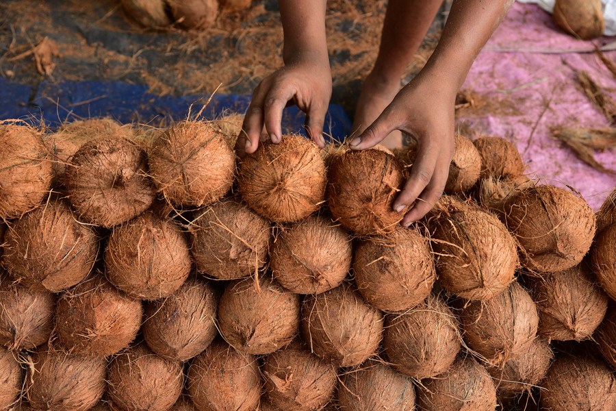 A roadside vendor arranges coconuts for sale in Morigaon district of India's northeastern state of Assam, Sept. 2, 2023. (Str/Xinhua)