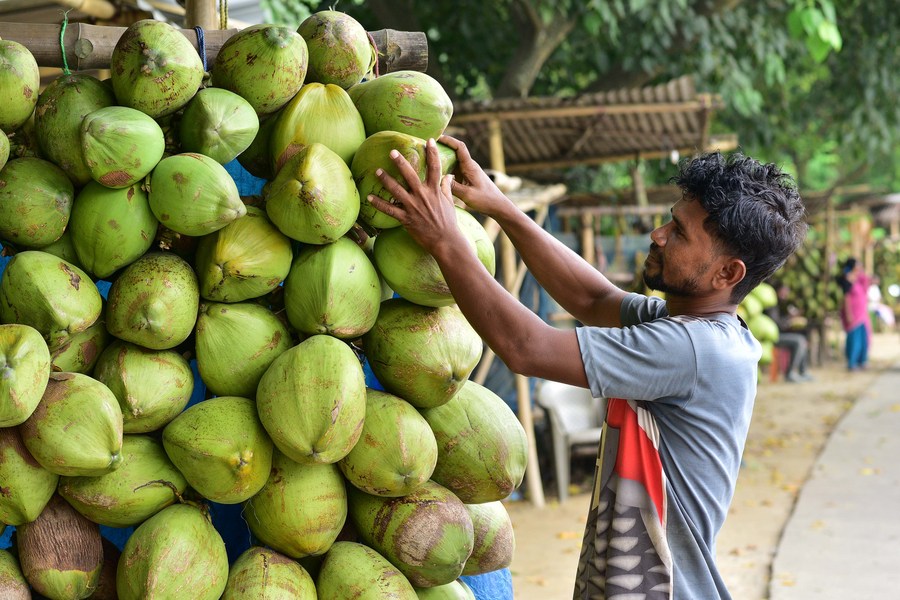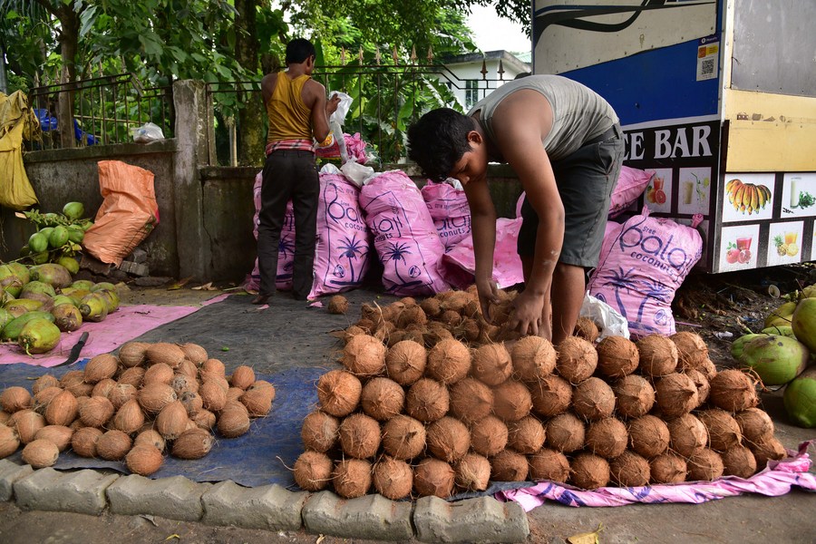 A roadside vendor sells coconuts in Morigaon district of India's northeastern state of Assam, Sept. 2, 2023. (Str/Xinhua)