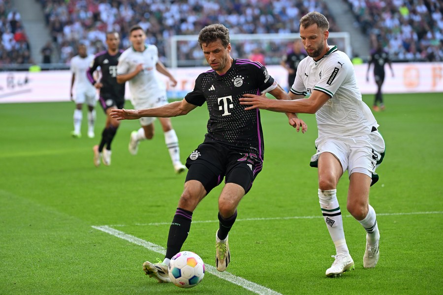 Marvin Friedrich (R) of Borussia Monchengladbach vies with Thomas Mueller of FC Bayern Munich during their first division of Bundesliga 3rd round match in Monchengladbach, Germany on Sept. 2, 2023. (Photo by Ulrich Hufnagel/Xinhua)