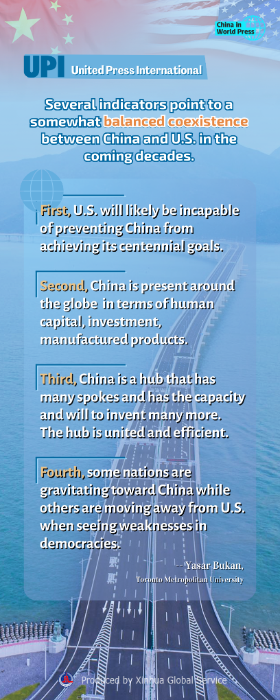 U.S. will likely be incapable of preventing the second-biggest economy from achieving its centennial goals, UPI quoted a scholar who listed indicators of why a balanced coexistence status will be established between China and U.S. in the coming decades. #ChinaInWorldPress