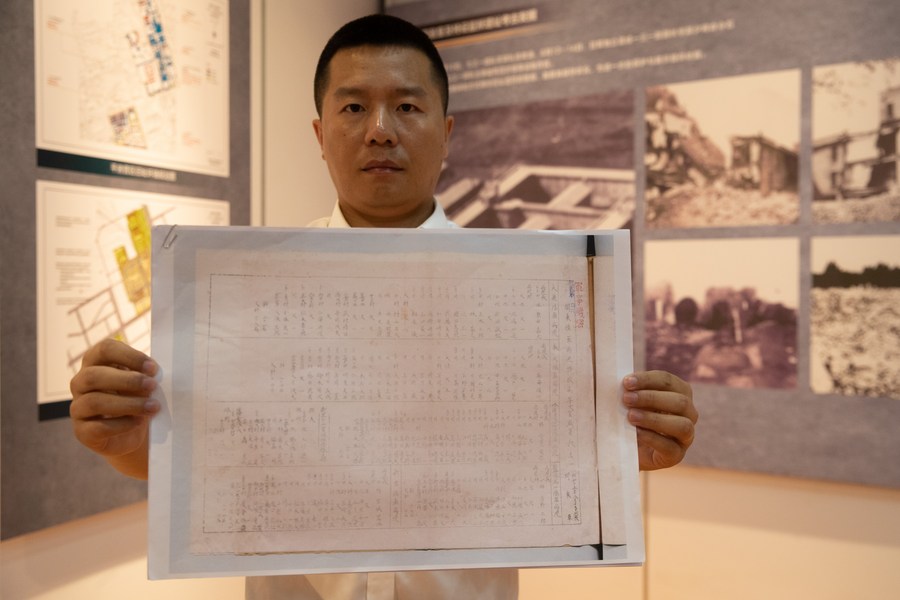 Jin Shicheng, a researcher with the exhibition hall, presents new evidence of "crimes committed by Unit 731 through military-medical coordination" at the Exhibition Hall of Evidences of Crime Committed by Unit 731 of the Japanese Imperial Army in Harbin, northeast China's Heilongjiang Province, Sept. 2, 2023. (Xinhua/Zhang Tao)