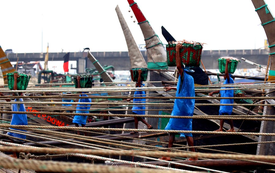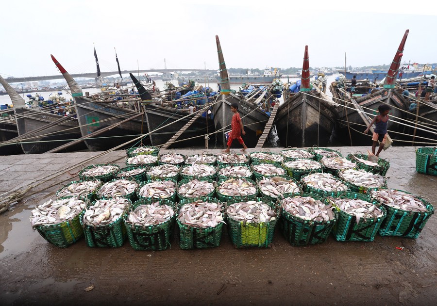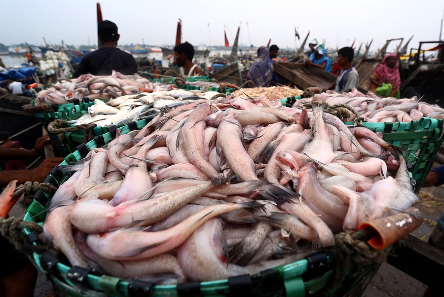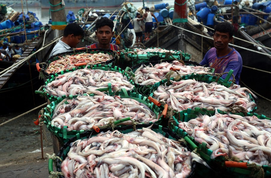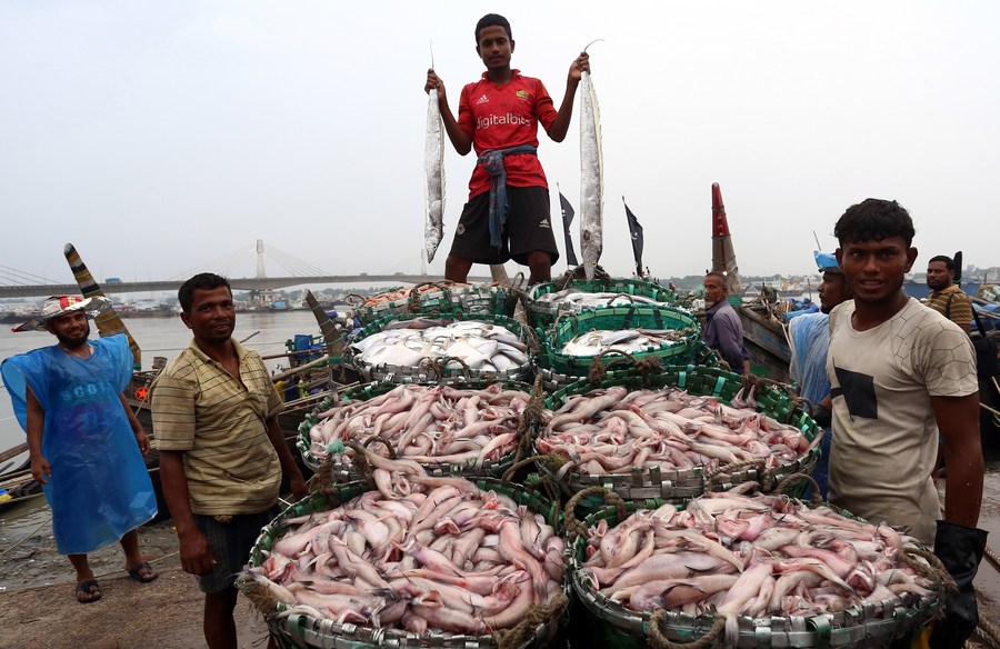 People unload fish at a market in Bangladesh's seaport city of Chattogram, Sept. 2, 2023. (Xinhua)
