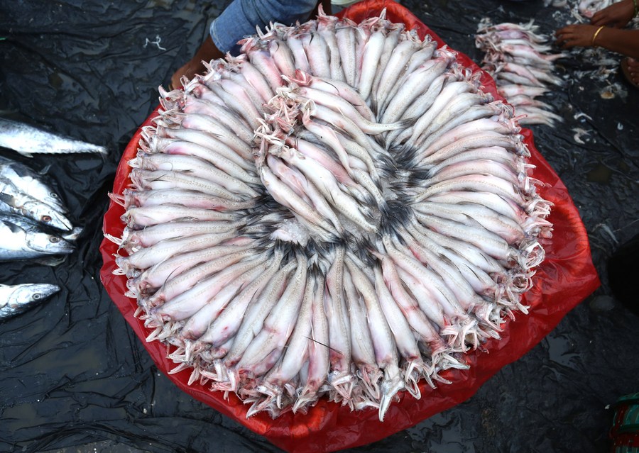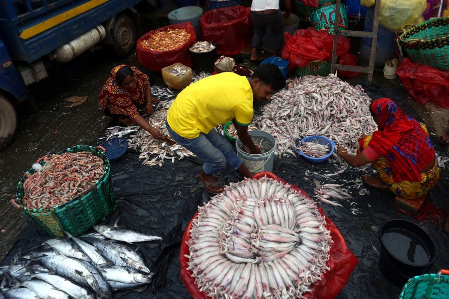 Vendors arrange fish at a market in Bangladesh's seaport city of Chattogram, Sept. 2, 2023. (Xinhua)
