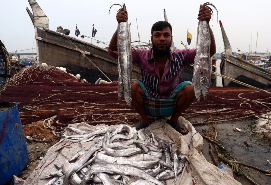 A laborer shows fish at a market in Bangladesh's seaport city of Chattogram Sept. 2, 2023. (Xinhua)