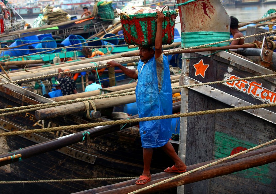 A laborer unloads fish at a market in Bangladesh's seaport city of Chattogram Sept. 2, 2023. (Xinhua) ■