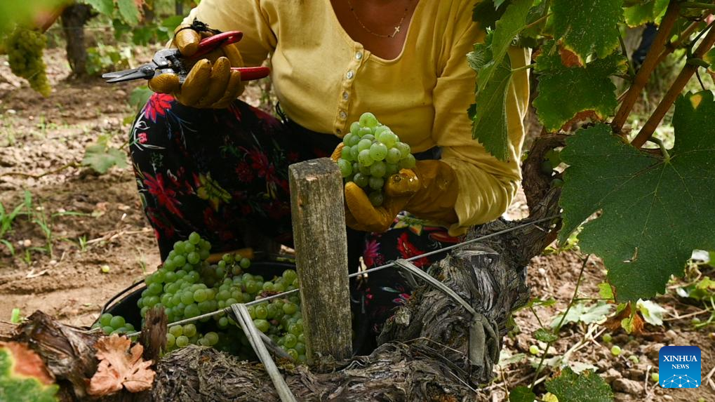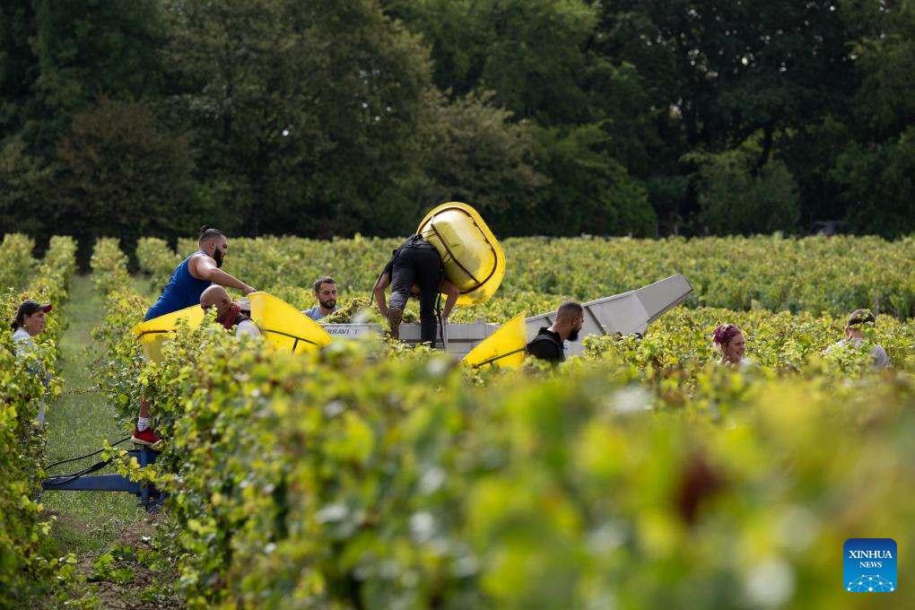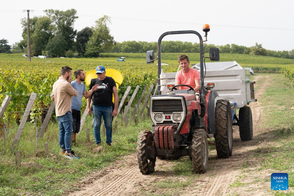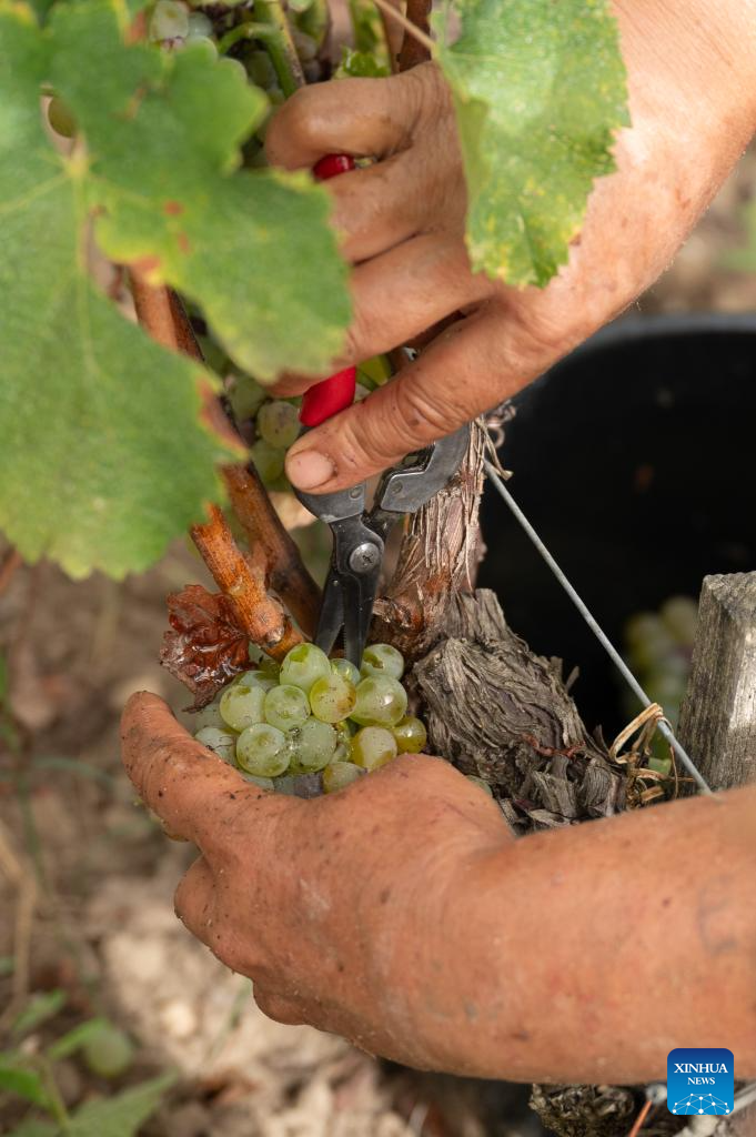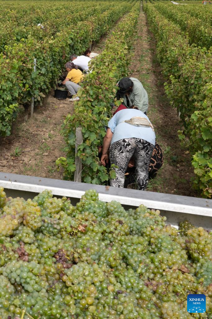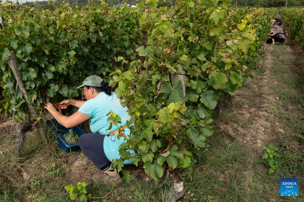 People collect grapes at Carbonnieux Castle in Leognan, Bordeaux, France, Sept. 4, 2023. The white grape harvest has begun in Bordeaux, southwest of France. (Photo by Veronique Tauran/Xinhua)