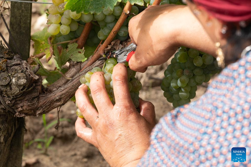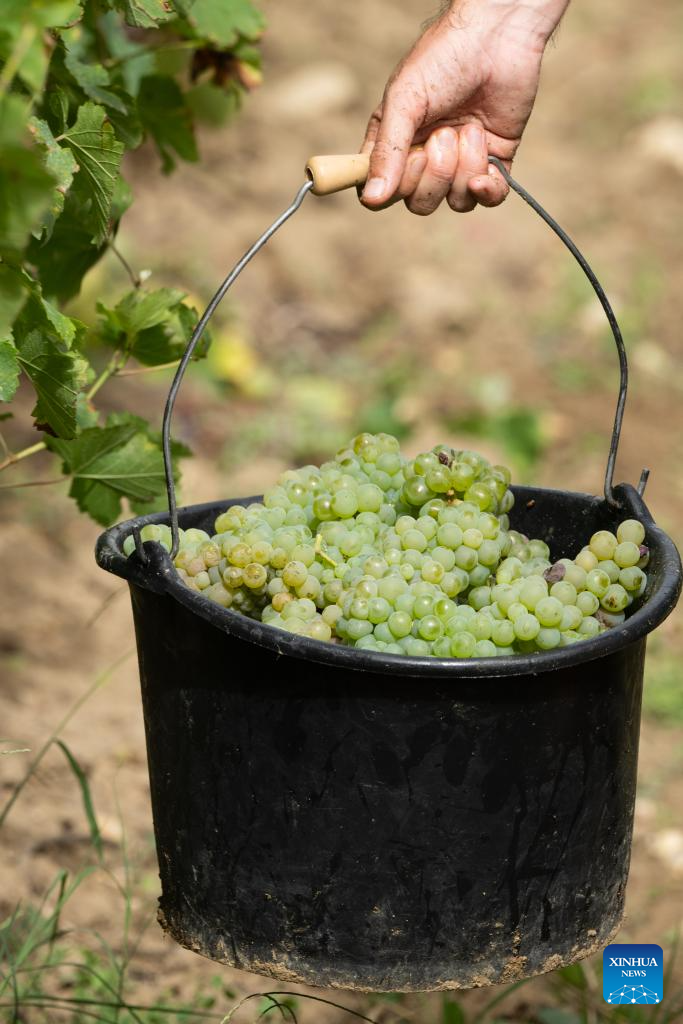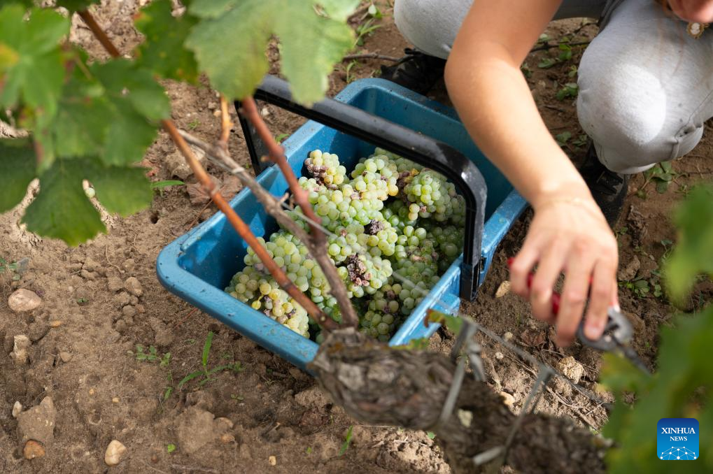 A worker collects grapes at Carbonnieux Castle in Leognan, Bordeaux, France, Sept. 4, 2023. The white grape harvest has begun in Bordeaux, southwest of France. (Photo by Veronique Tauran/Xinhua)