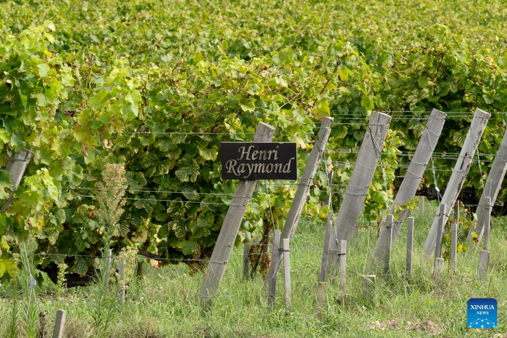 This photo taken on Sept. 4, 2023 shows grapes at Carbonnieux Castle in Leognan, Bordeaux, France. The white grape harvest has begun in Bordeaux, southwest of France. (Photo by Veronique Tauran/Xinhua)