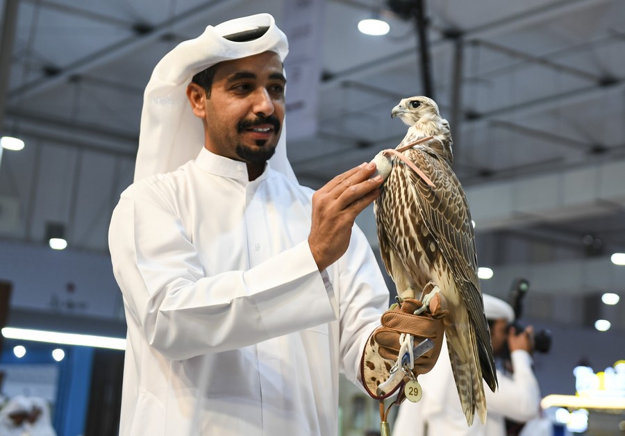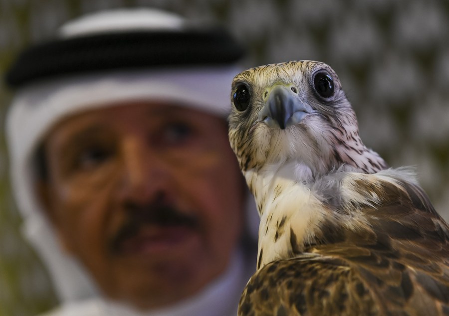 An exhibitor shows a falcon during the seventh edition of Katara International Hunting and Falcons Exhibition 2023 at Katara Cultural Village in Doha, Qatar, Sept. 5, 2023. The event is held here from Sept. 5 to 9 with the participation of more than 190 international exhibitors. (Photo by Nikku/Xinhua)