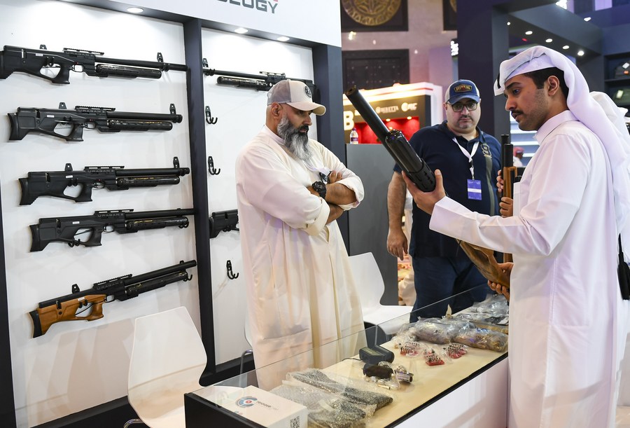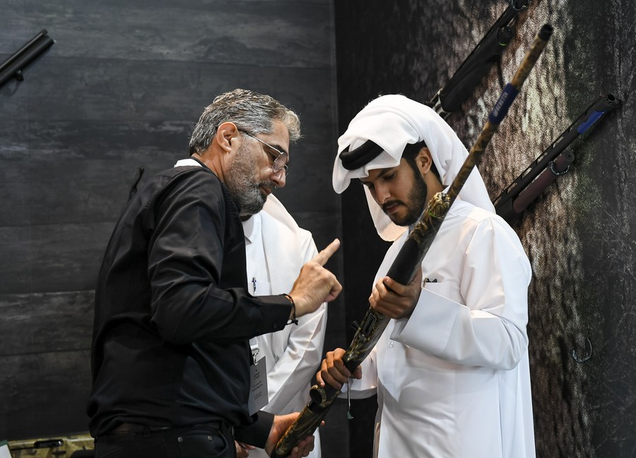 People look at a hunting rifle in the guns section of the seventh edition of Katara International Hunting and Falcons Exhibition 2023 at Katara Cultural Village in Doha, Qatar, Sept. 5, 2023. (Photo by Nikku/Xinhua)
