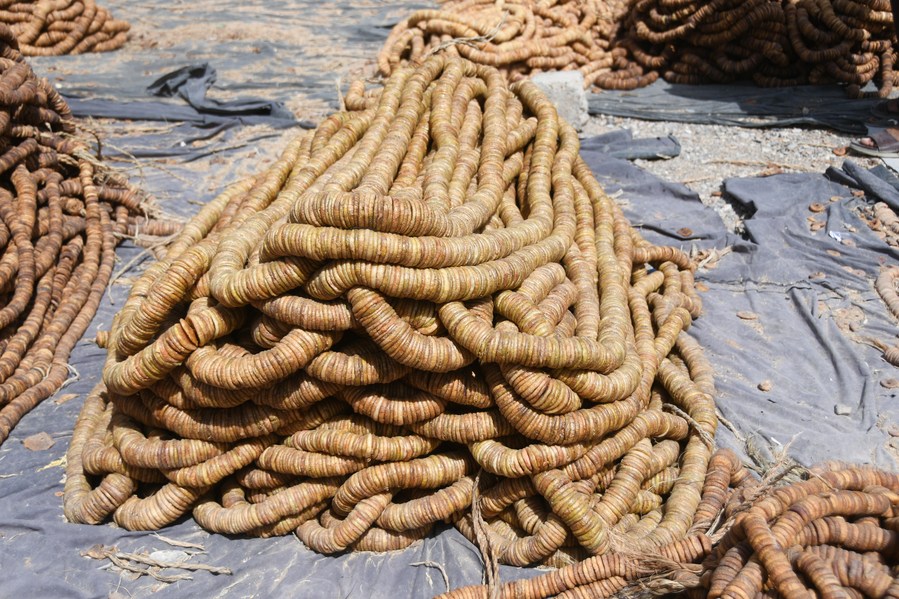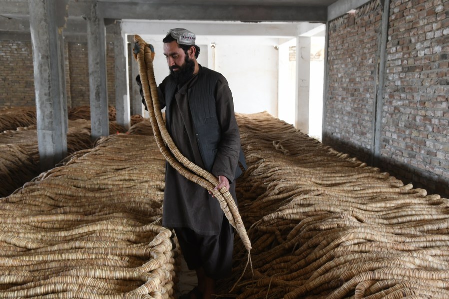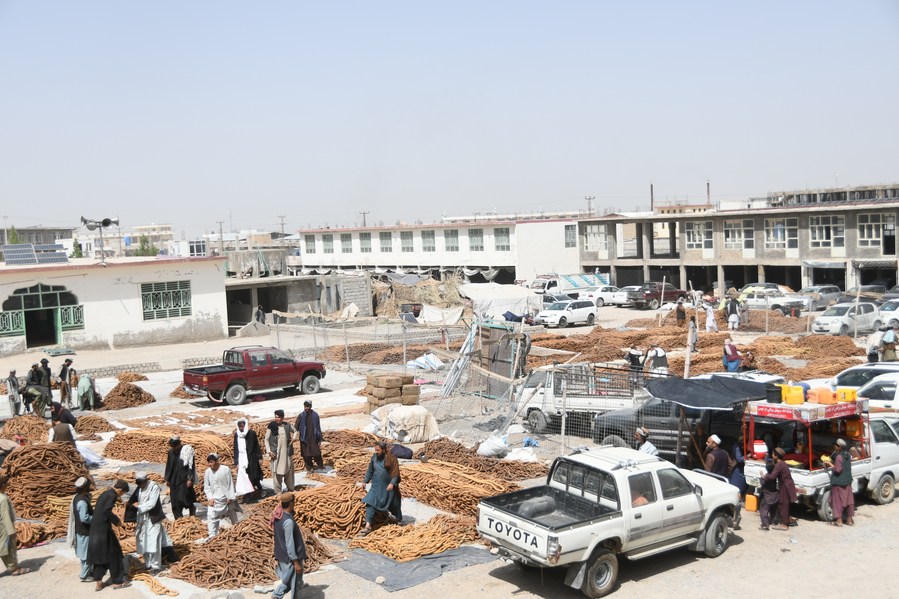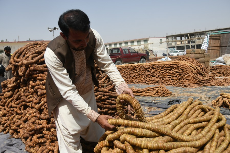 Afghans work at a market selling dried figs in Kandahar province, Afghanistan, Sept. 4, 2023. (Photo by Arghand/Xinhua)