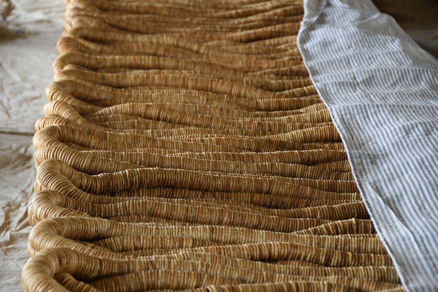 A man arranges dried figs at a market in Kandahar province, Afghanistan, Sept. 4, 2023. (Photo by Arghand/Xinhua)