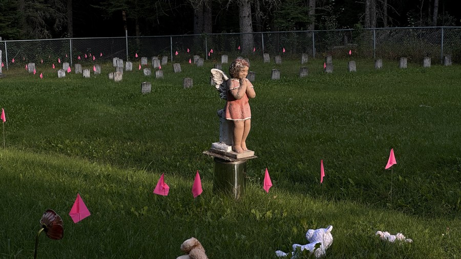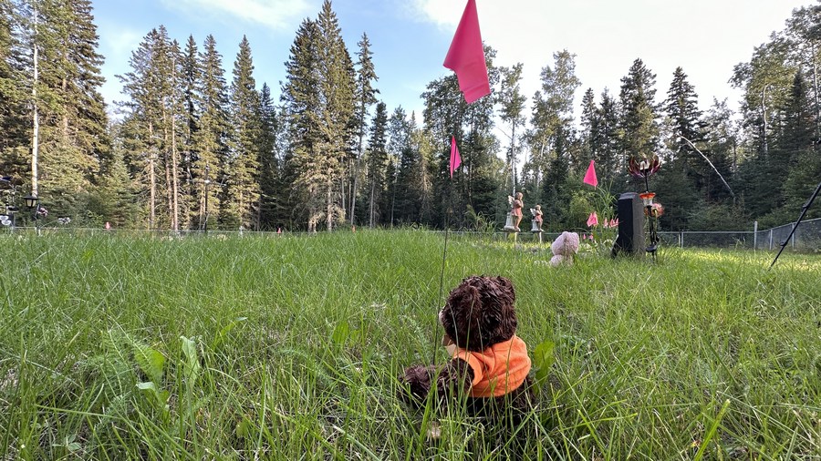 Toys and pink flags are seen placed on the ground to mark suspected child or infant graves in Beauval, Saskatchewan, Canada, on Aug. 31, 2023. (Photo by Li Haitao/Xinhua)