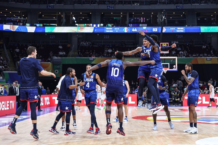 U.S. players celebrate winning their quarterfinal against Italy at the 2023 FIBA World Cup in Manila, the Philippines on Sept. 5, 2023. (Xinhua/Wu Zhuang)