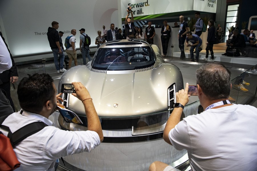 Visitors take photos of a Porsche car during the 2023 International Motor Show, officially known as the IAA MOBILITY 2023, in Munich, Germany, Sept. 5, 2023. (Xinhua/Zhang Fan)