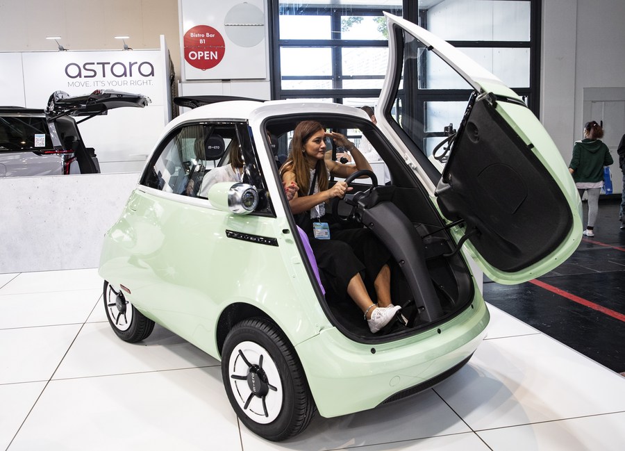 People sit inside a new energy vehicle during the 2023 International Motor Show, officially known as the IAA MOBILITY 2023,in Munich, Germany, Sept. 5, 2023. (Xinhua/Zhang Fan)