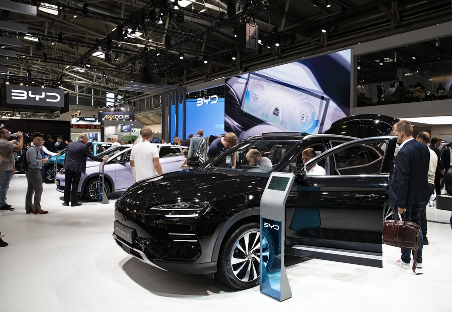 People visit the booth of Chinese carmaker BYD during the 2023 International Motor Show, officially known as the IAA MOBILITY 2023, in Munich, Germany, Sept. 5, 2023.(Xinhua/Zhang Fan)