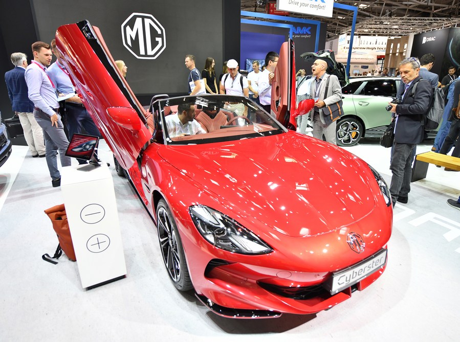 People look at a Cyberster vehicle at the booth of MG during the 2023 International Motor Show, officially known as the IAA MOBILITY 2023, in Munich, Germany, Sept. 5, 2023. (Xinhua/Ren Pengfei)