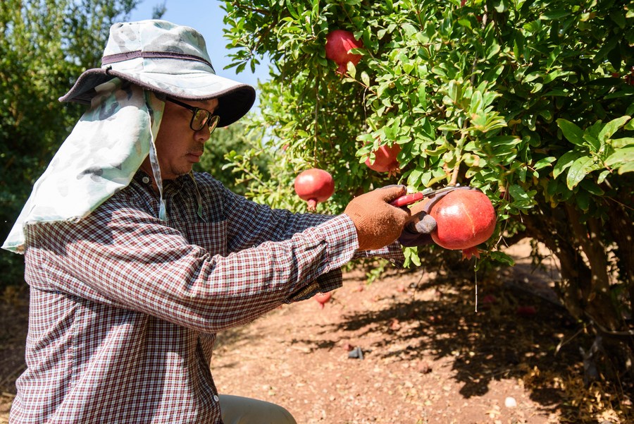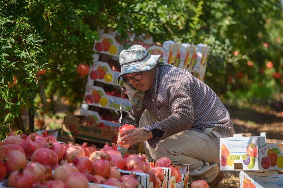 A man harvests pomegranates at a field in the village of Yesud HaMa'ala, northern Israel, on Sept. 6, 2023. (Ayal Margolin/JINI via Xinhua)