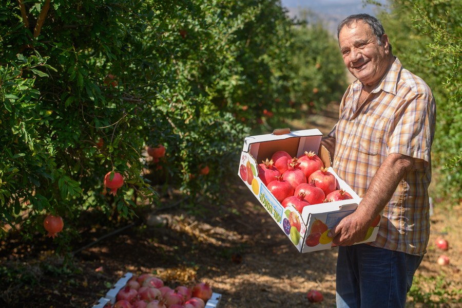 A man presents harvested pomegranates at a field in the village of Yesud HaMa'ala, northern Israel, on Sept. 6, 2023. (Ayal Margolin/JINI via Xinhua) ■