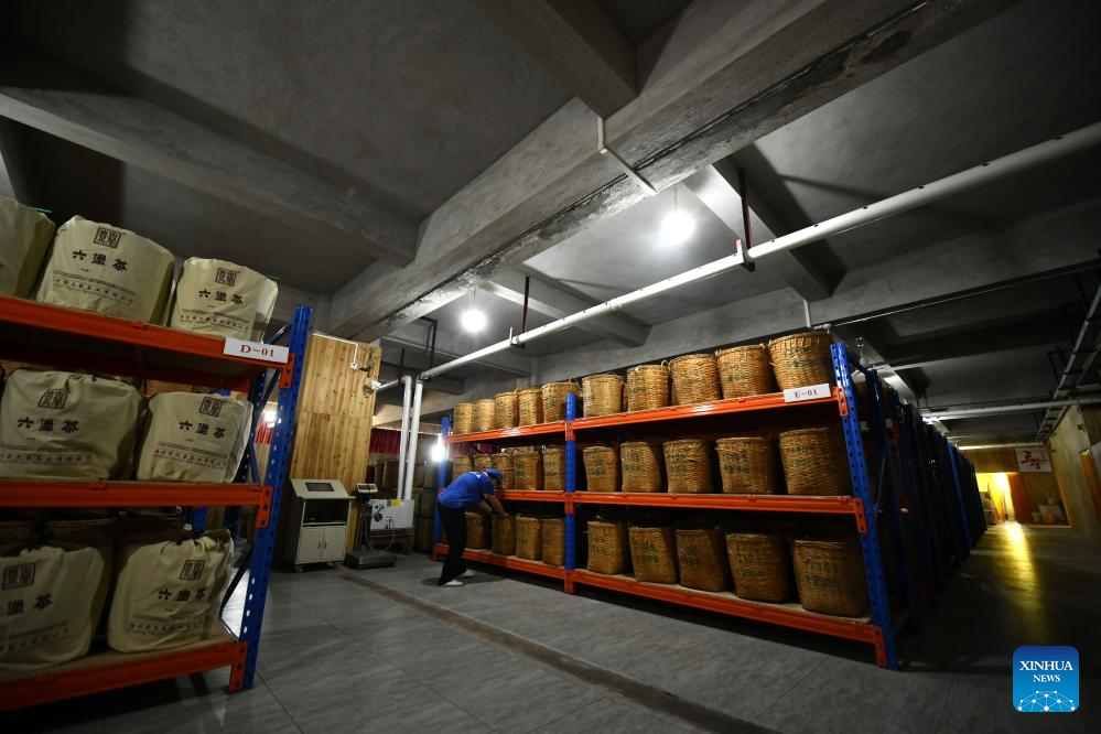 A worker puts tea products on shelves in a tea company in Wuzhou City, south China's Guangxi Zhuang Autonomous Region, June 8, 2023.