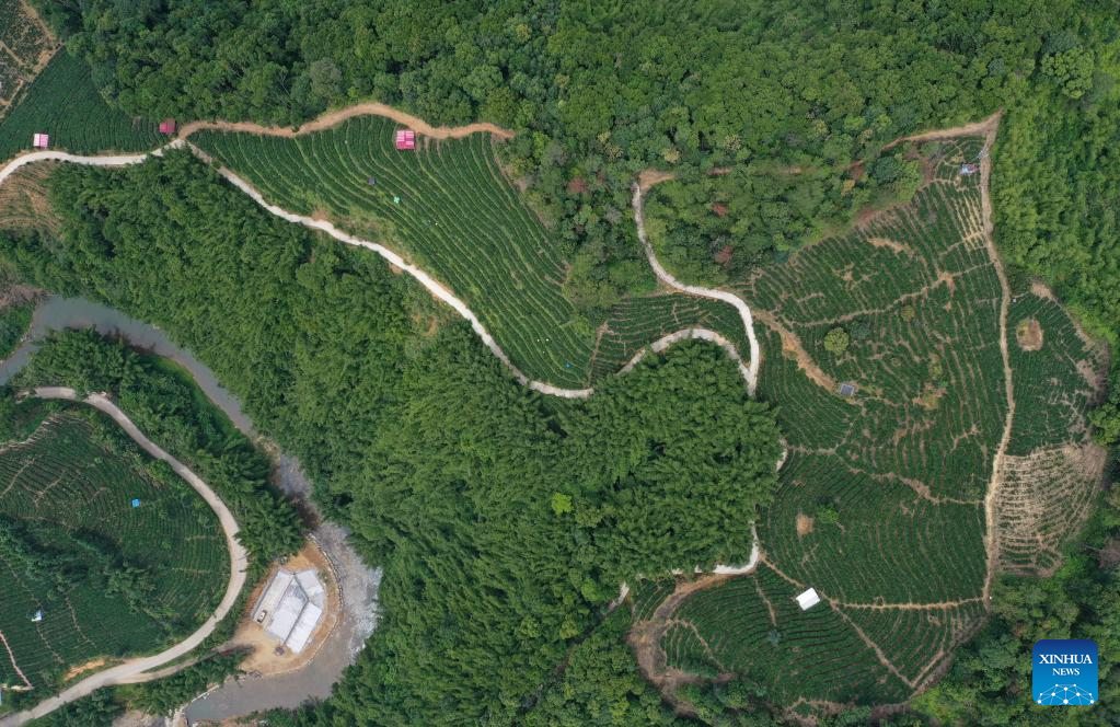 This aerial photo taken on Sept. 6, 2023 shows a tea garden in Liubao Town of Cangwu County in Wuzhou City, south China's Guangxi Zhuang Autonomous Region.