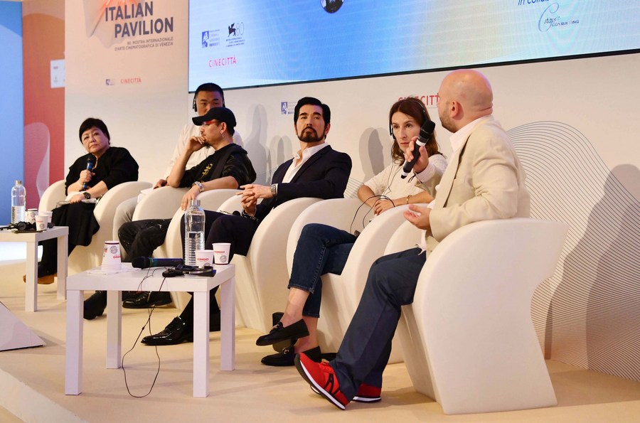 Chinese-American singer and actor Kris Phillips (3rd R) attends a panel discussion themed on "Genre Trends in Global Film Production" during the 80th Venice International Film Festival in Venice, Italy, Sept. 3, 2023. (Xinhua/Jin Mamengni)