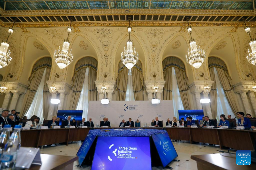 Leaders of central and eastern European countries attend the plenary session of the Bucharest Summit of the Three Seas Initiative in Bucharest, Romania, on Sept. 6, 2023. The important decisions adopted at the Bucharest Summit of the Three Seas Initiative (TSI) on Wednesday will contribute to further strengthening the cross-border interconnections of the member countries through transport, energy and digitization, Romanian President Klaus Iohannis said on Wednesday. (Photo by Cristian Cristel/Xinhua)