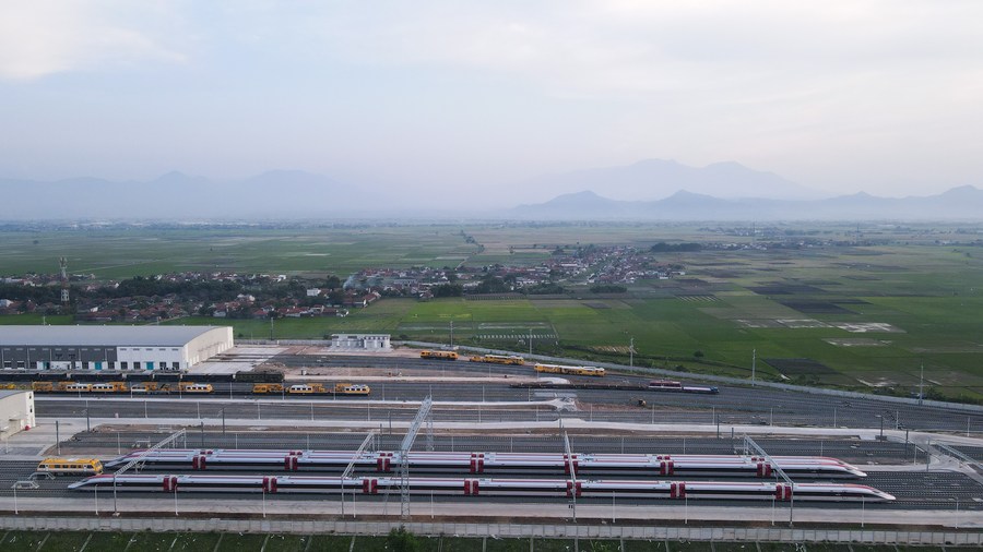This aerial photo taken on July 20, 2023 shows high-speed railway trains parking near the joint workshop for Jakarta-Bandung High-Speed Railway in Bandung, West Java Province, Indonesia. (Xinhua/Xu Qin)