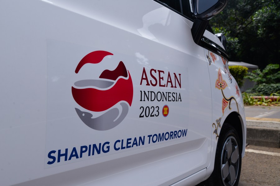 This photo taken on Sept. 6, 2023 shows the logo of the 43rd Association of Southeast Asian Nations (ASEAN) Summit on a Wuling Air electric vehicle for the summit in Jakarta, Indonesia. (Xinhua/Xu Qin)