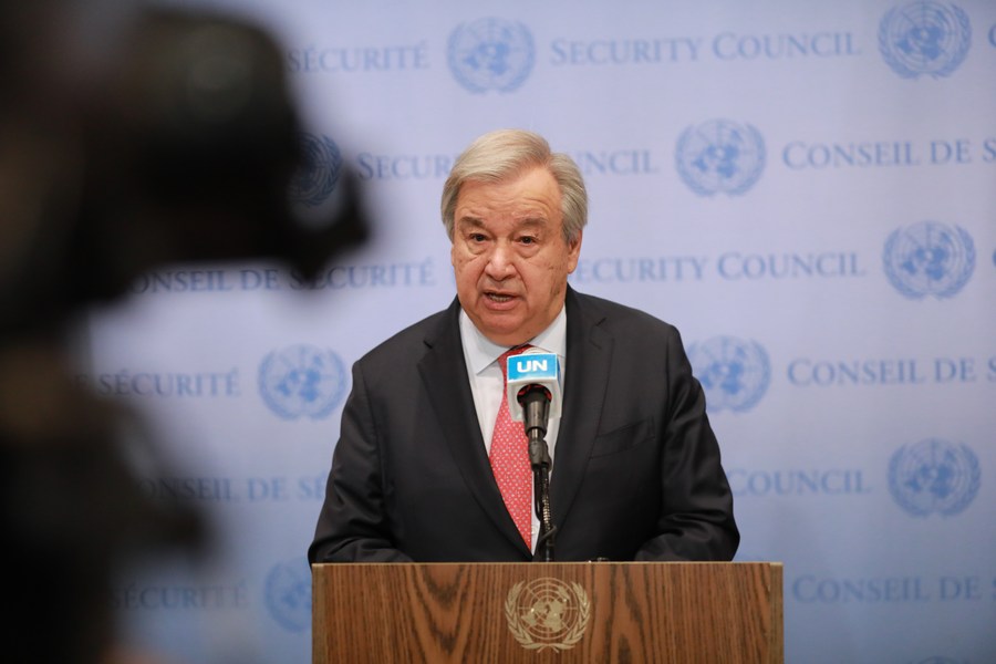UN Secretary-General Antonio Guterres speaks to the press on the Black Sea Grain Initiative outside the Security Council Chamber at the UN headquarters in New York, July 17, 2023. (Xinhua/Xie E)