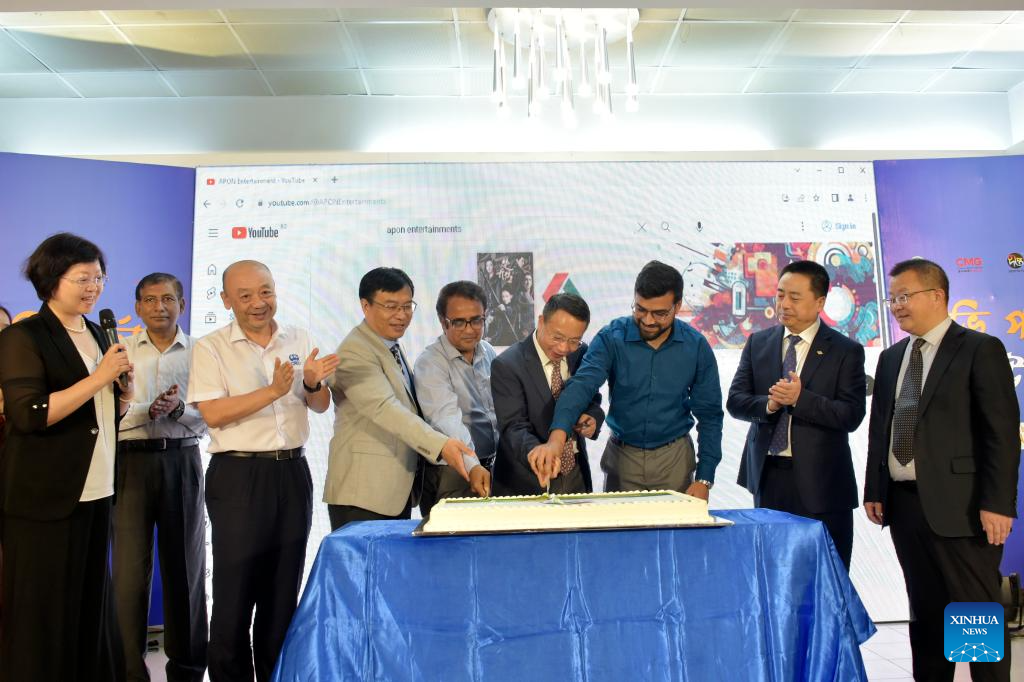 Guests slice a celebration cake during an event titled "China Festival on the TV Screen" in Dhaka, Bangladesh, Sept. 5, 2023. (Xinhua)