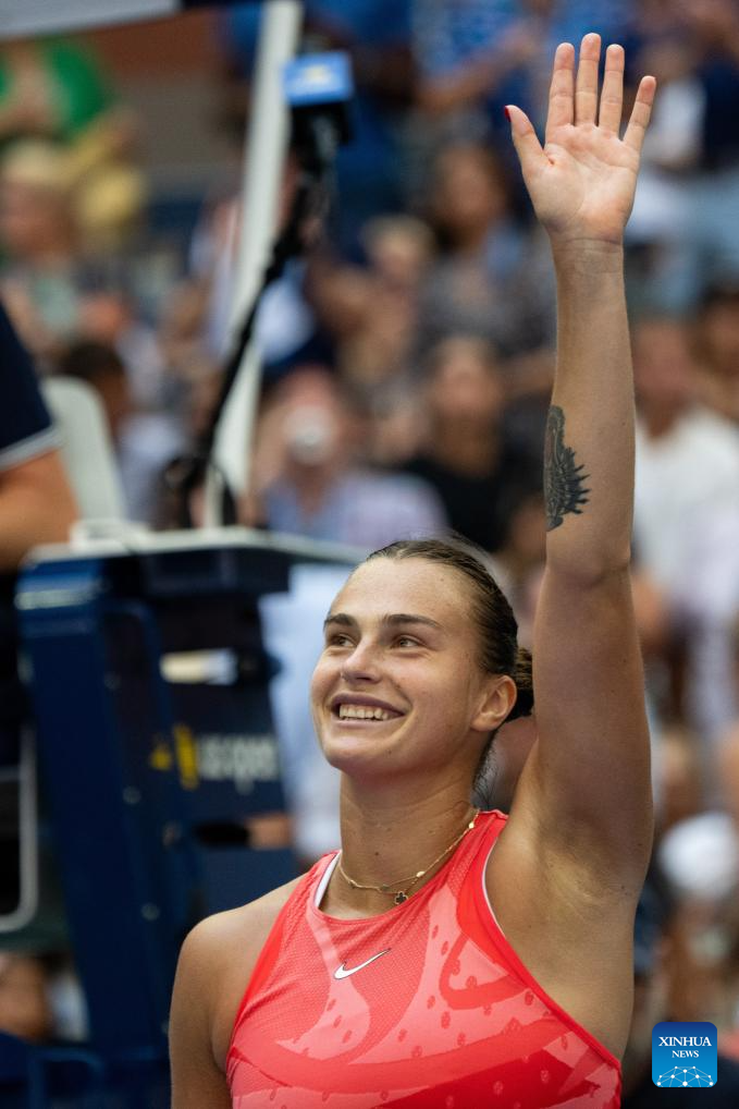 Aryna Sabalenka of Belarus celebrates after winning the women's singles quarterfinal against Zheng Qinwen of China at the 2023 US Open tennis championships in New York, the United States, Sept. 6, 2023. (Xinhua/Liu Jie)