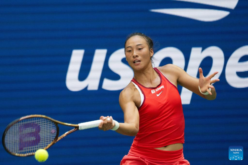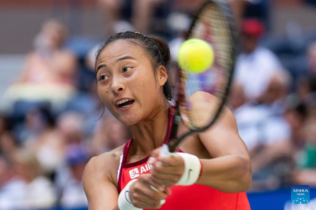 Zheng Qinwen of China hits a return during the women's singles quarterfinal against Aryna Sabalenka of Belarus at the 2023 US Open tennis championships in New York, the United States, Sept. 6, 2023. (Xinhua/Liu Jie)
