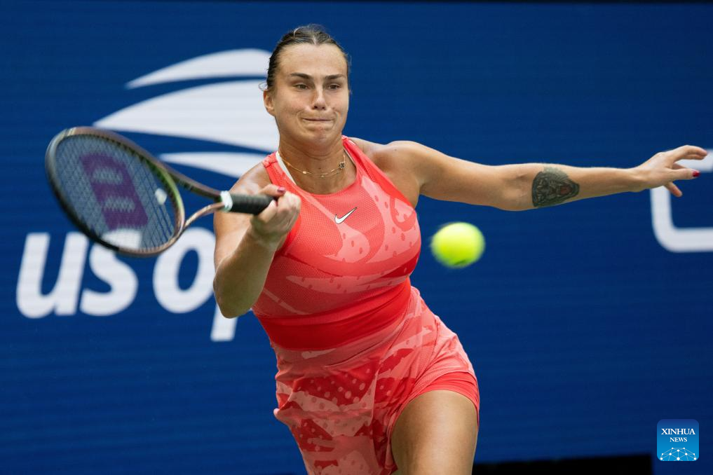 Aryna Sabalenka of Belarus hits a return during the women's singles quarterfinal against Zheng Qinwen of China at the 2023 US Open tennis championships in New York, the United States, Sept. 6, 2023. (Xinhua/Liu Jie)