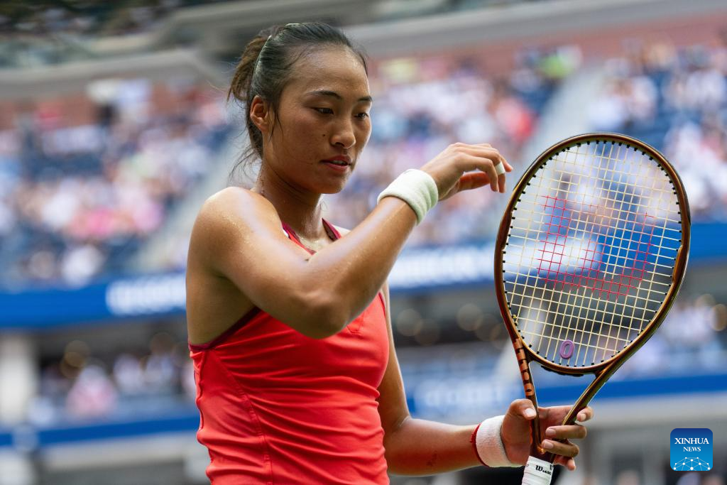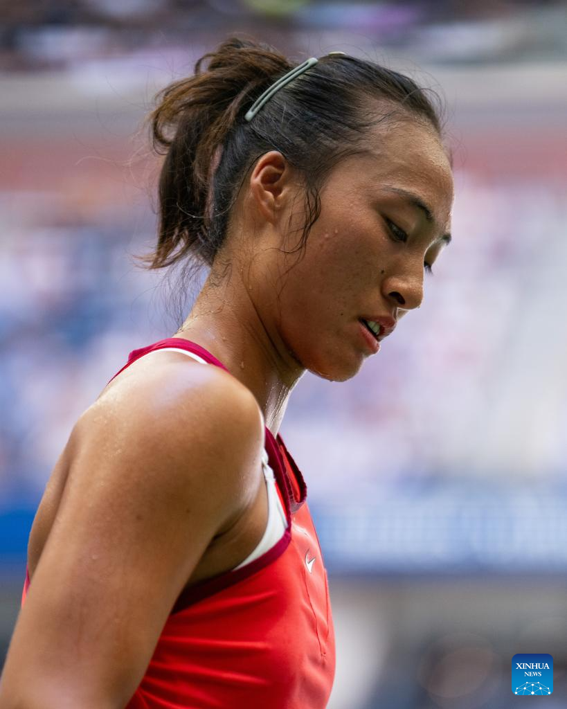 Zheng Qinwen of China reacts during the women's singles quarterfinal against Aryna Sabalenka of Belarus at the 2023 US Open tennis championships in New York, the United States, Sept. 6, 2023. (Xinhua/Liu Jie)