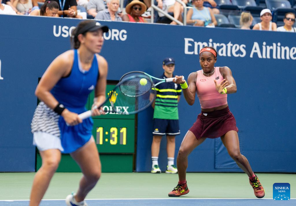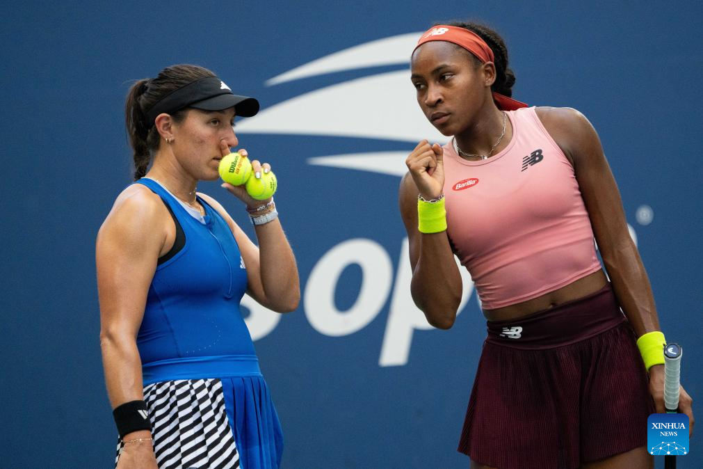 Coco Gauff (R)/Jessica Pegula compete during the women's doubles quarterfinal between Wang Xinyu of China/Hsieh Su-Wei of Chinese Taipei and Coco Gauff of the United States/Jessica Pegula of the United States at the 2023 US Open tennis championships in New York, the United States, Sept. 6, 2023. (Xinhua/Liu Jie)