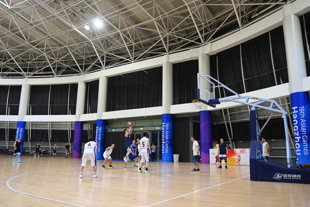 ↑Citizens play basketball at Huanglong Sports Center, which is the sports venue for handball at Hangzhou 2023 Asian Games in Hangzhou, east China's Zhejiang Province, Aug. 21, 2023.