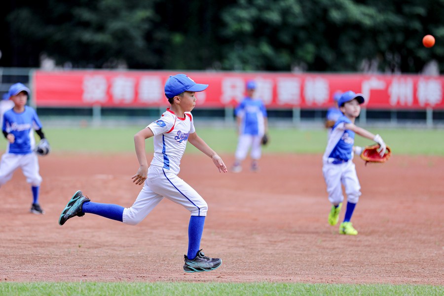 ↑Children play baseball at Tianhe Baseball and Softball Stadium, which was the sports venue for softball at Guangzhou 2010 Asian Games in Guangzhou, south China's Guangdong Province, Aug. 22, 2023.