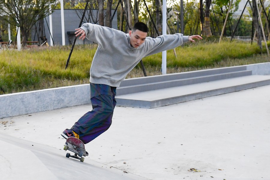 ↑A citizen enjoys skateboarding at Gongshu Canal Sports Park, which is the sports venue for table tennis, hockey and breakdancing at Hangzhou 2023 Asian Games in Hangzhou, east China's Zhejiang Province, Nov. 9, 2021.