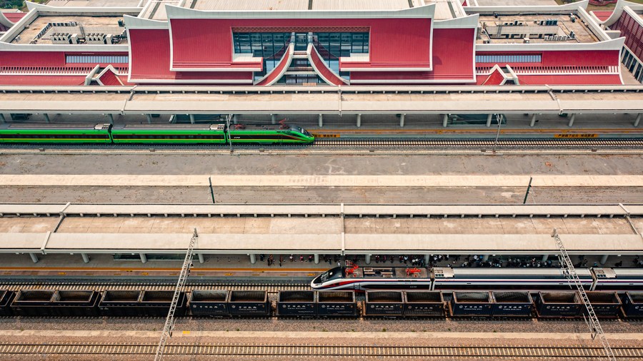 This aerial photo taken on April 13, 2023 shows the Fuxing (top) and Lane Xang electric multiple unit (EMU) trains at the Mohan railway station of the China-Laos Railway in southwest China's Yunnan Province. (Xinhua/Hu Chao)