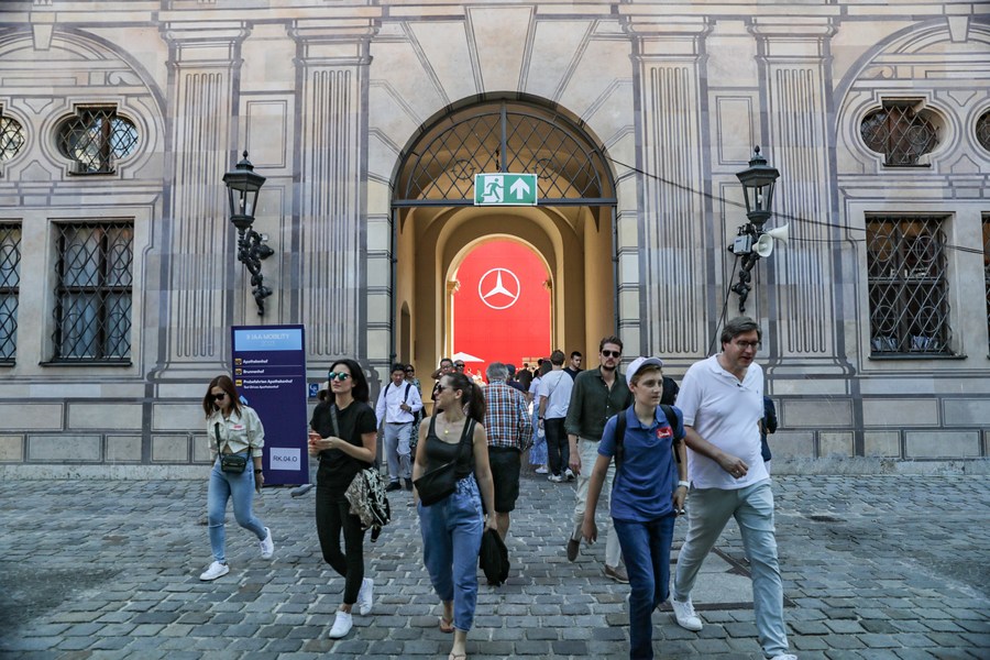 People leave the Mercedes-Benz booth at 2023 International Motor Show, officially known as the IAA MOBILITY 2023, in Munich, Germany, Sept. 8, 2023. (Xinhua/Zhang Fan)
