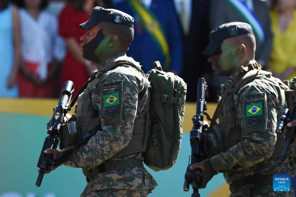 Soldiers parade in celebration of the 201st anniversary of Brazil's Independence in Brasilia, capital of Brazil, on Sept. 7, 2023. Brazil's President Luiz Inacio Lula da Silva on Thursday took part in celebrations of the country's independence on Sept. 7, 1822, presiding over a military and civic parade flanked by military commanders. (Photo by Lucio Tavora/Xinhua)