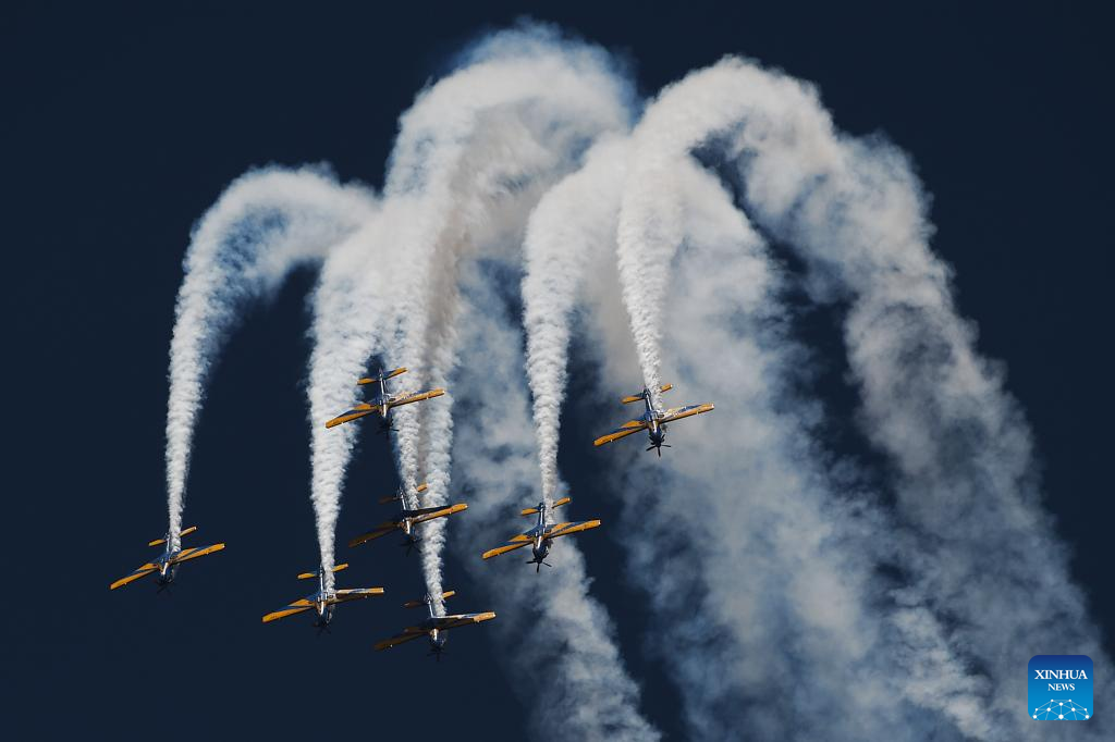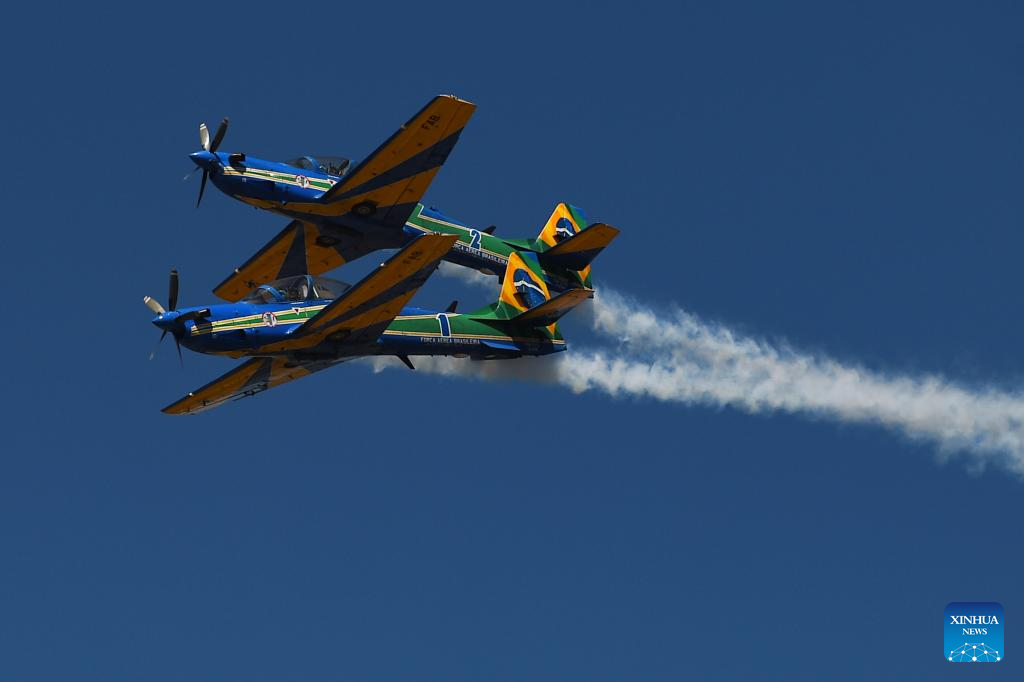 An airshow is held in celebration of the 201st anniversary of Brazil's Independence in Brasilia, capital of Brazil, on Sept. 7, 2023. Brazil's President Luiz Inacio Lula da Silva on Thursday took part in celebrations of the country's independence on Sept. 7, 1822, presiding over a military and civic parade flanked by military commanders. (Photo by Lucio Tavora/Xinhua)