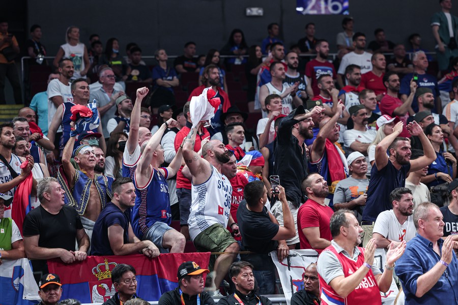 Serbia fans cheer their team on during the quarterfinal against Lithuania at the 2023 FIBA World Cup in Manila, the Philippines on Sept. 5, 2023. (Xinhua/Wu Zhuang)