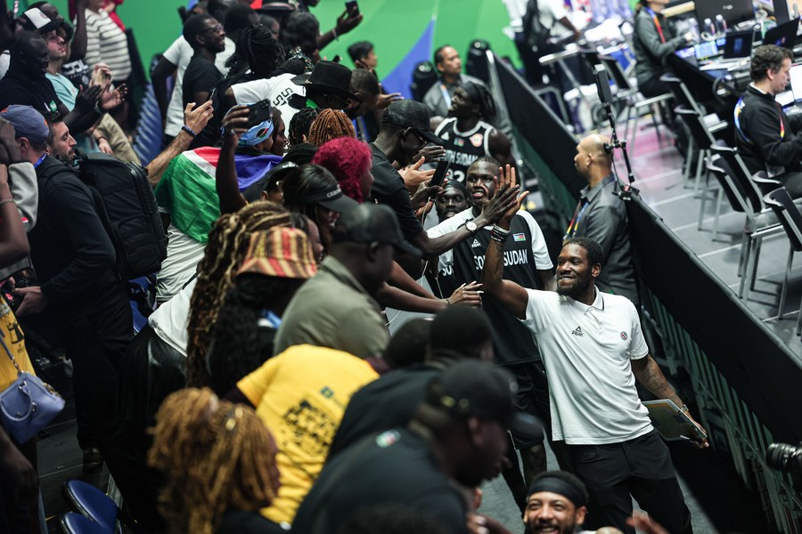 South Sudan coach Royal Ivey (R) celebrates with fans after the classification round 17-32 match against Angola on Sept. 2, 2023. (Xinhua/Wu Zhuang)