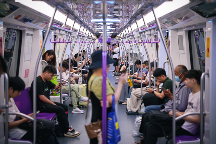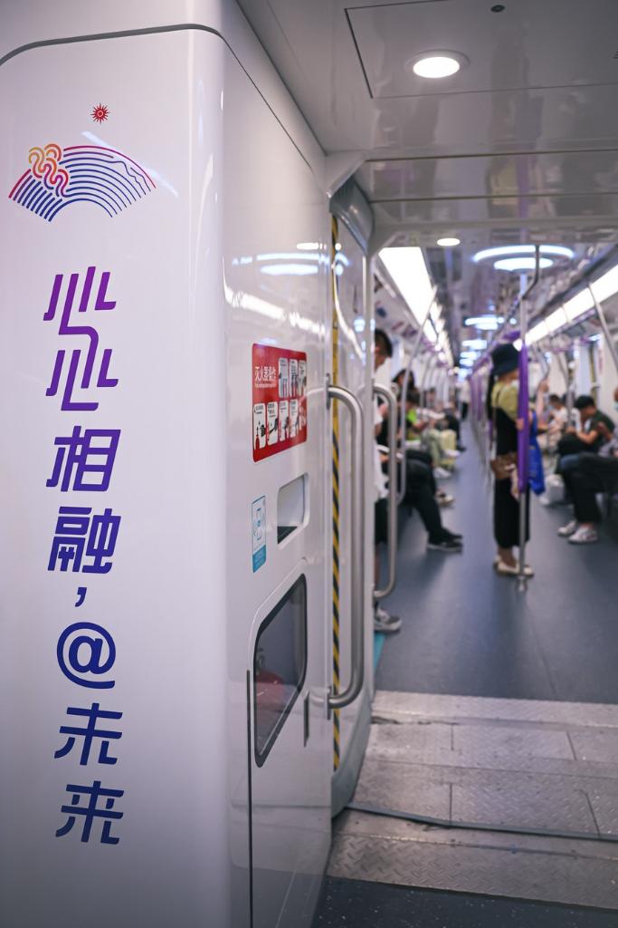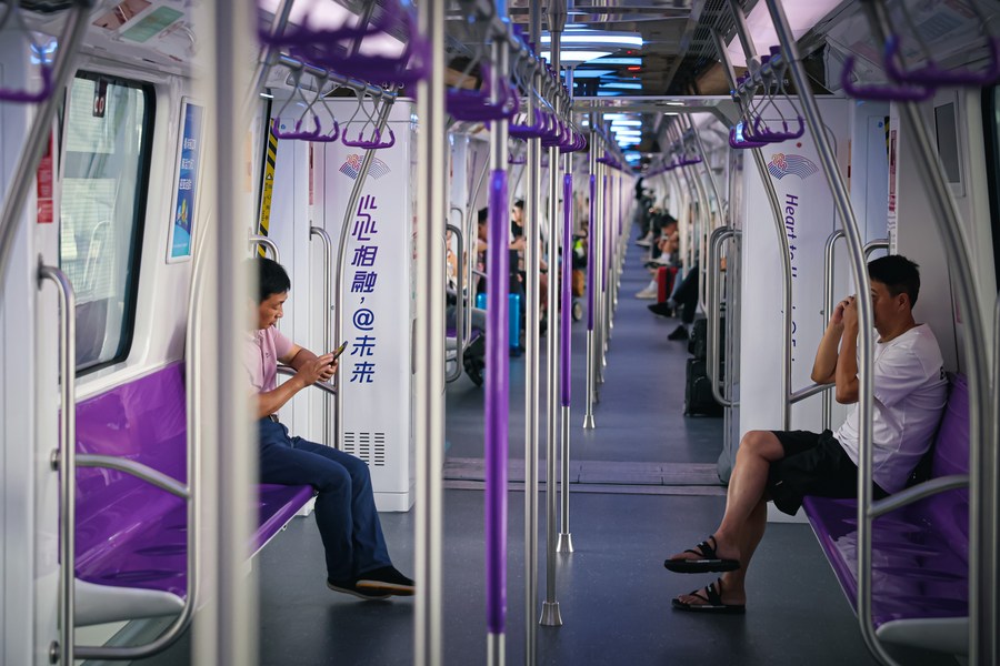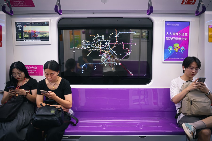 People ride a subway train adorned with the 19th Asian Games elements in Hangzhou, capital of east China's Zhejiang Province on Sept. 5, 2023.