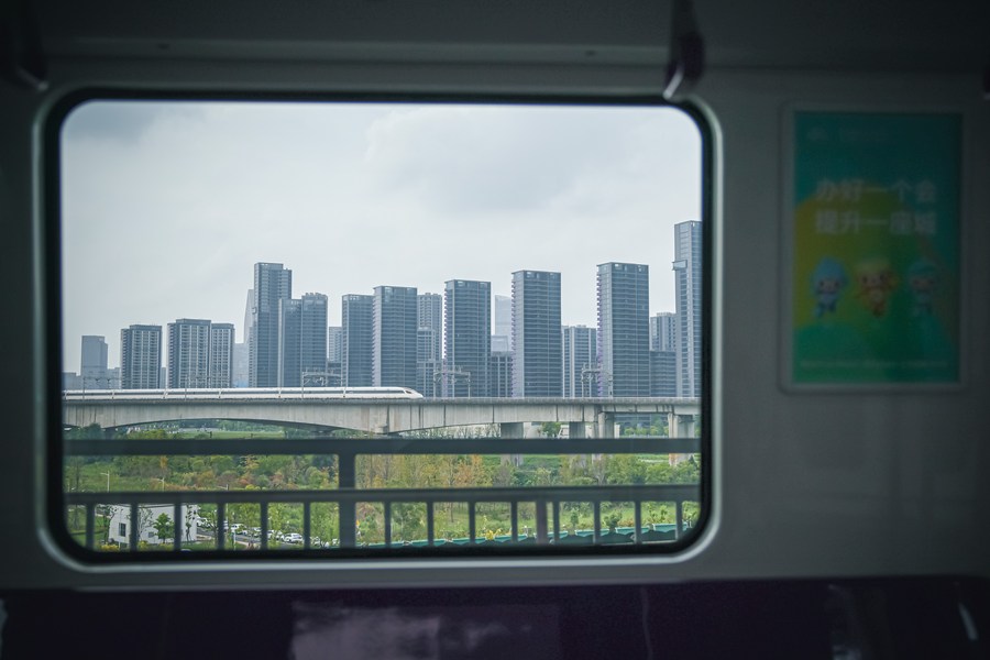 A subway train adorned with the 19th Asian Games elements passes through Hangzhou Asian Games Village in Hangzhou, capital of east China's Zhejiang Province on Sept. 5, 2023.